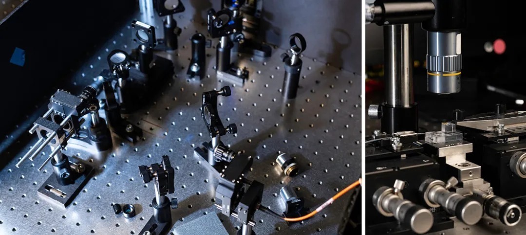 传统的干涉术(左)需要精心设置的镜子和激光系统,所有这些都需要非常辛苦和仔细地校准。” Cardenas说,“Song提炼了所有这些,并将其放入一个光子芯片中。”芯片只需要一个显微镜(右)。资料来源: University of Rochester / J. Adam Fenster