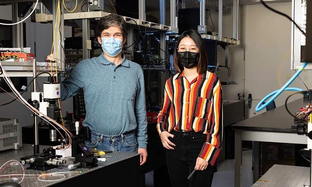 Jaime Cardenas (左) 和 Meiting Song 在Rochester光学研究所的 Cardenas 实验室。来源:Universityof Rochester / J. Adam Fenster