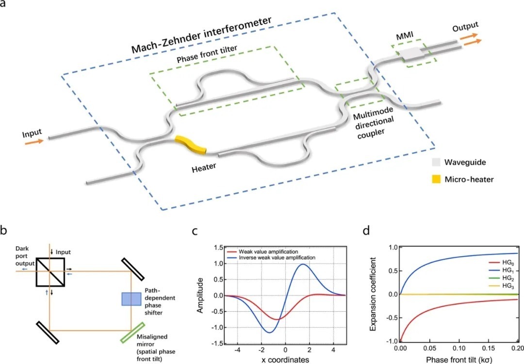 一种芯片上的弱值器件的原理图,由带有相位前倾角的MZI和作为读出的MMI组成。加热器对波导施加一个相移。b自由空间Sagnac弱值放大干涉仪。c相对于探测器坐标,在弱值放大(红色)和反弱值放大(蓝色)设置下自由空间暗口的光束剖面。在反弱值状态下,光束剖面类似于HG1模式,而在弱值状态下,它类似于HG0模式。d反弱值放大光束剖面的Hermite-Gaussian系数。